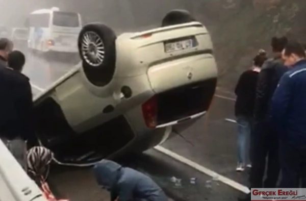 Kaza, Zonguldak Ereğli yolu üzerinde meydana geldi. İddiaya göre, yağmurdan dolayı kayganlaşan yolda direksiyon hakimiyetini kaybeden otomobil sürücüsü yoldan çıkarak takla attı. Araçta bulunan 2 kişi yaralandı. Yaralılar ambulansla hastaneye kaldırıldı.