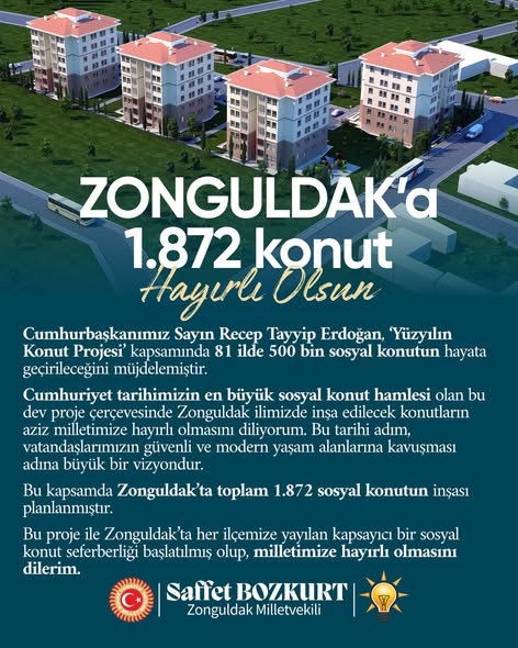 Cumhurbaşkanı Recep Tayyip Erdoğan, “Yüzyılın Konut Projesi” kapsamında 81 ilde toplam 500 bin sosyal konutun hayata geçirileceğini açıkladı. Türkiye Cumhuriyeti tarihinin en büyük sosyal konut hamlesi olarak nitelendirilen proje kapsamında Zonguldak’ta da 1.872 sosyal konut inşa edilecek.